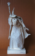 Autre différence importante : l’origami traditionnel est censé être une petite distraction populaire que le grand public peut pratiquer, et donc, supposé être relativement simple, rapide, reproductible, décrit du premier au dernier pas. Au lieu de cela, cette série de Barbares est le fruit de nombreux essais improvisés que j’ai commencé à expérimenter surtout avec les masques. Le nombre de plis est ici très important (plusieurs centaines) ; les déformations des couches de papier plus ou moins aléatoires et souvent complexes, et ces modèles comportent toujours une grande part d’improvisation. Alors c’est moi, et parfois plutôt que moi, le papier lui-même qui a dirigé le travail. Mes modèles ne sont donc pas reproductibles. Même moi, je suis généralement incapable d’en produire une copie !